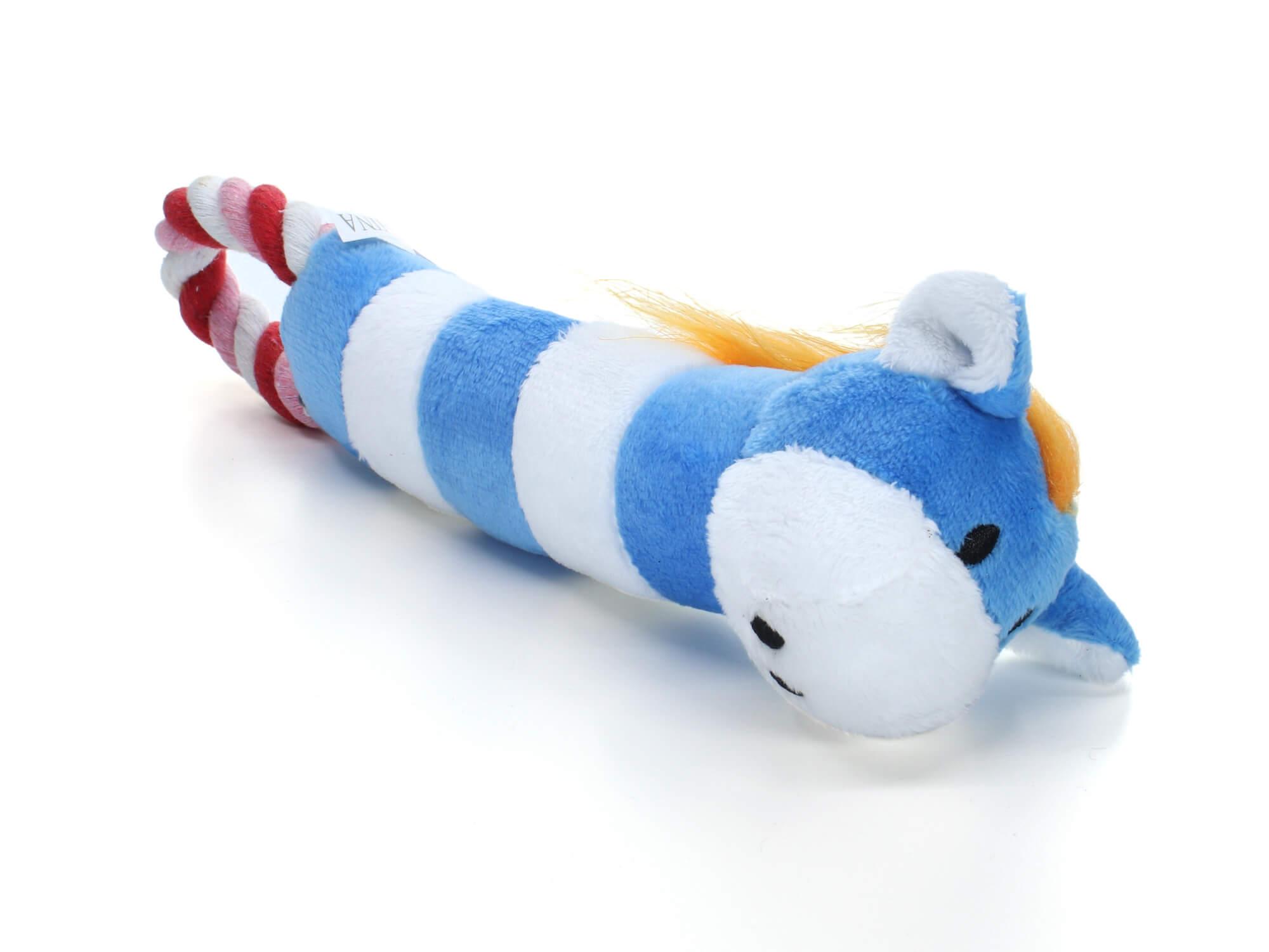 Podlouhlá psí hračka se stane skvělým parťákem během utahaných a nudných dnů. Pes si ji oblíbí především pro příjemný materiál a pískací zvuk.